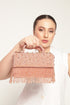 This exclusive box style clutch is sure to capture everyone's attention with its luxurious design. It features a short, heavy gold chain for added elegance and is beautifully adorned with intricate sequin and pearl work, making it a perfect statement piece for any occasion.