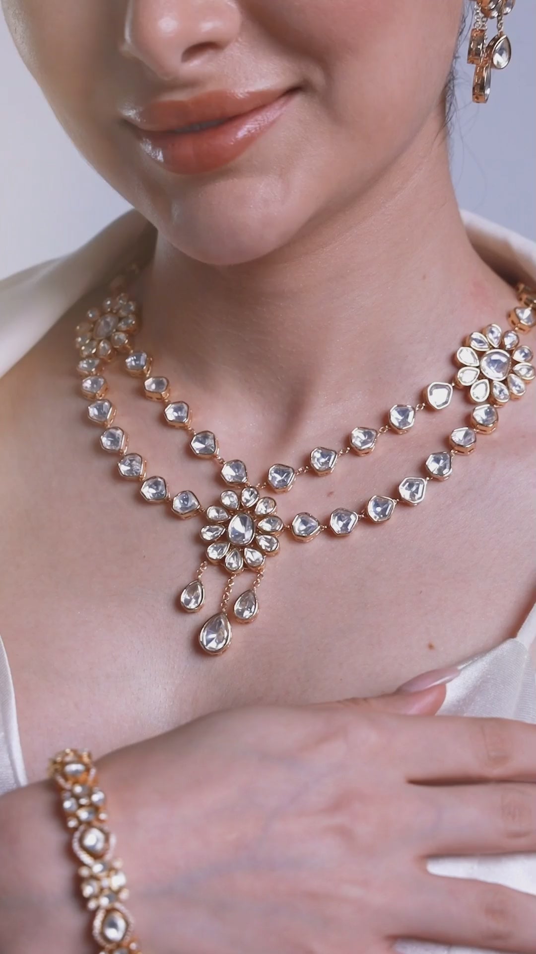 Turn heads effortlessly with this layered marvel in gold plating, featuring dazzling moissanite Kundan and matching earrings — a true showstopper that steals every stare.