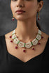 Gracefully layered with shell pearls and adorned in Bikaneri Jadau Kundanโthis timeless set in ruby and emerald tones is your perfect festive plus-one.